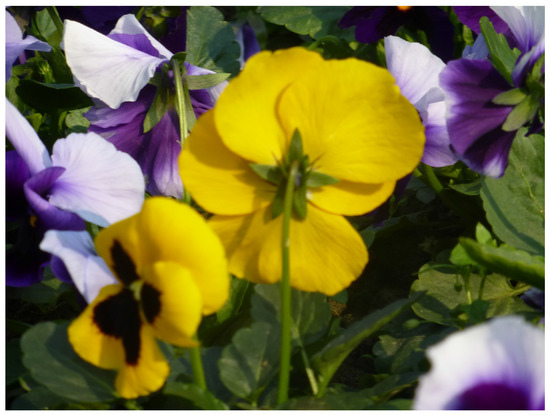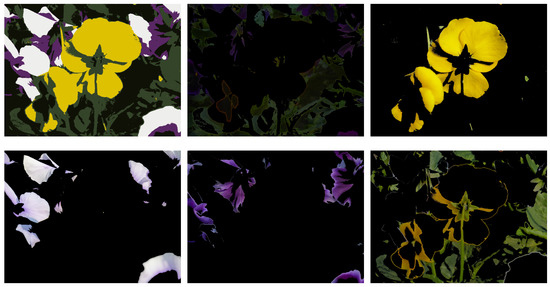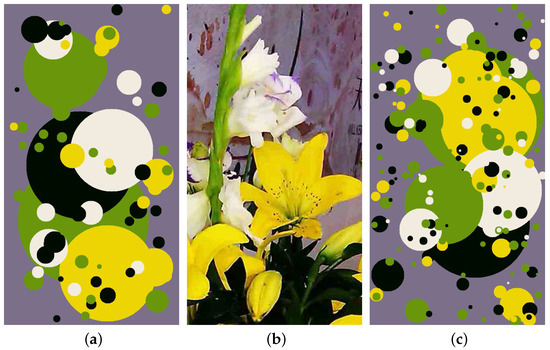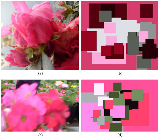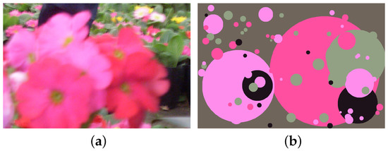 To generate abstract paintings, the first step is to select pictures depending on the creator’s requirements. Pictures with a pleasing appearance or color scheme always have certain color composition ratios, i.e., their color composition ratios conform to particular mathematical relationships and satisfy visual aesthetic preferences [28,29,30]. The pictures in the experiments in this paper are predominantly photos of flowers; some are from Baidu pictures, and some were taken by the authors.