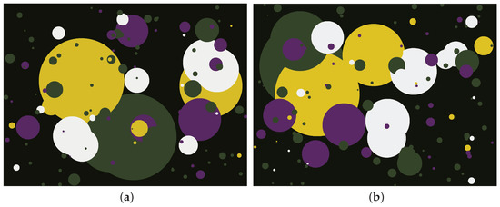 - The circles are drawn based on the size of the independent color patches and finally sorted in descending order. The radius of a circle is , and the center of a circle is :where is the width of the original picture, i.e., M; is the width of the original picture, N; and is a random number. Using a random number indicates that different abstract images can be generated based on the same original image. The fill color in the round circle is the color after clustering (except for the background color). Figure 5a is an abstract painting generated by our method.