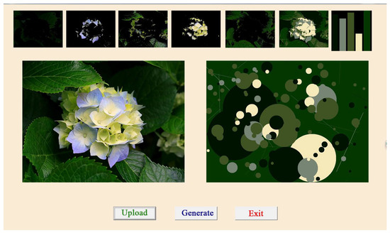 In this paper, we designed an application system (Figure 8) that uses a source image to construct an abstract painting. The main color composition and patches appear on the interface. Finally, a part of an abstract picture composed of these colors is formed (Figure 9, Figure 10 and Figure 11). If the user selects to re-create the same original picture, the colors will be randomly reconstructed, and all results are automatically saved. Then, the creator can select their preferred picture from the results.