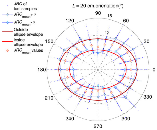 Here, we take a sample in the length of 20 cm as an example. All measured values and the mean values of JRC in every orientation on one polar plot are shown in Figure 1. It can be found that the JRC values are randomly distributed from 0 to 20 in each orientation. Then, the JRC values in the orientations of 90° and 270° are smaller, while the JRC values in some orientations such as 0° and 180° are relatively greater. Performing a calculated analysis, the JRC average value and variance of each angle orientation are obtained by the statistical analysis. For example, the average value JRCmean and standard deviation σ of JRC values for 20 cm joint samples in the 0° orientation are 9.653 and 1.716, respectively. The smaller standard deviation indicates that the data points tend to the mean value.