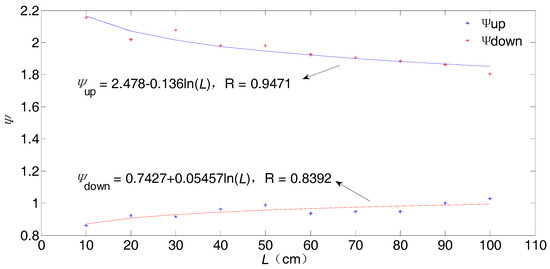 Based on the NN anisotropic parameter ψ, the interval ranges of the anisotropic parameters of all sizes are shown in Figure 3. Both the upper and lower bounds are fitted by the logarithmic curves, where the upper curve decreases and the lower curve increases as L increases.