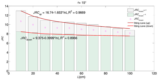 When the orientation is 15°, the JRC values on the increase of the joint sample sizes are shown in Figure 4, which apparently exhibit a negative scale effect. Then, the fitting curves present the logarithmic functions with monotonously-decreasing trends, and then both the upper and lower bounds are matched well.