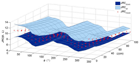 To find the relationship between the JRC values and the two variables θ and L, through numerical analyses, the trigonometric function polynomial of θ and L can fit into two smooth surfaces of the upper and lower bounds in the three-dimensional coordinate system, as shown in Figure 6. It is obvious that all of the points of mean values fall between the upper and lower surfaces. That is to say, the uncertain range almost contains all JRC values. Thus, the fitting equations based on the upper and lower surfaces of JRC values are presented as follows: