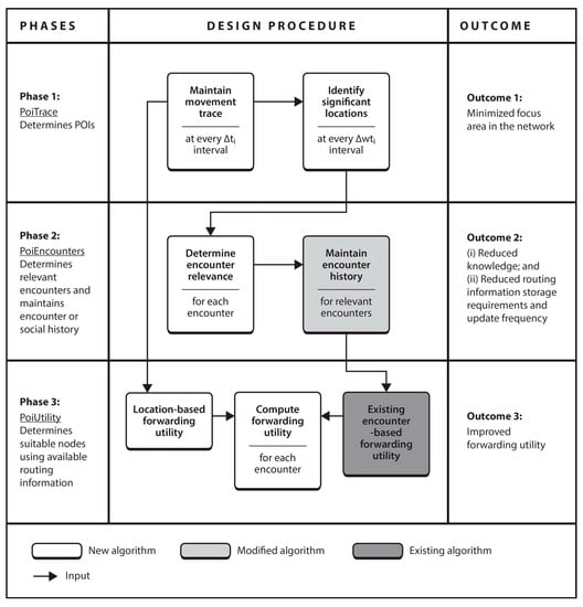 Our model in Section 3 showed that maintaining encounter history about more nodes leads to more contact information overhead, which is in turn directly proportional to the delay incurred in exchanging contact information and the energy utilized in the process. Therefore, less contact information implies less delay and energy consumption. The only problem is how to achieve this without degrading throughput. PoiFord is focused on reducing the amount of encounter history maintained by nodes so that less contact information would be exchanged during encounters. The basic idea behind the approach is as follows. Users often return to their points-of-interest (POIs) in which they may encounter other users that visit the same location regularly. Thus, there is a high chance that most well-connected nodes have at least one mutual POI (e.g., users living in the same house or working in the same office). PoiFord aims to minimize contact information by requiring only nodes that have mutual POIs to maintain encounter history for each other. By limiting information to be maintained only for neighbors with mutual POIs, the problem of existing location-based solutions (i.e., inferring future encounters from location-based information alone) can be addressed while the forwarding ability of nodes that are less connected to the destination can be inferred from location-based information, specifically through spatial locality. That way, nodes moving towards a destination that is located in a shopping mall would carry a message and forward it to a node that has a mutual POI with the destination (i.e., a node whose user works in a shopping mall) to deliver it. Hence, the task of reducing contact information overhead without degrading throughput can be divided into three subtasks: