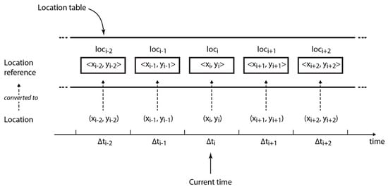 The location table, , which consists of time slots, is a set of elements, each known as a location reference (cf. Equation (6)). Each location reference is a tuple of the format , where () indicates the current time slot.