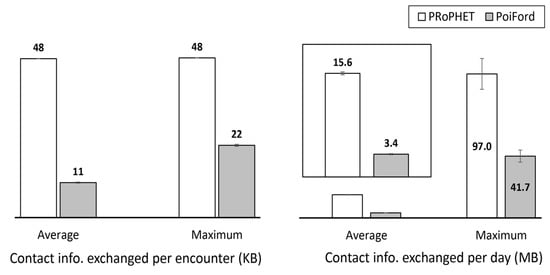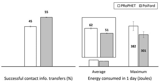 Section 3.2 explained the impact of contact information size on message forwarding in terms of data exchange success and energy consumption on nodes. In order to verify these claims, we allow the simulation to run without generating data messages, so that only contact information is exchanged when nodes encounter each other. Hence, in the simulation, nodes consume energy due to exchanging contact information alone. In order to investigate the impact of contact information size on data exchange success, we record the percent of contact information transfer attempts that were successful when nodes run under PRoPHET and PoiFord in Figure 9. Since nodes can forward messages only after a successful transfer of contact information, successfully transferring more number of contact information means more chances of exchanging messages. In order words, nodes running on PoiFord are able to forward more messages during encounters due to less contact information size. Figure 9 also shows that this allows PoiFord to consume less energy per contact information transfer, as it reduces the average and maximum energy consumed with PRoPHET in a day by 17.7% and 21.2%, respectively.