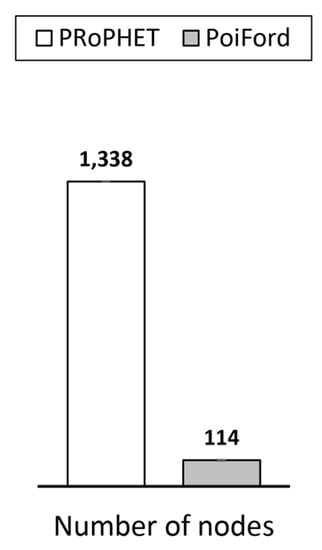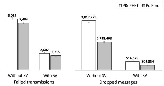 There are also other means through which PoiFord improves the performance of a routing protocol it is incorporated into. Locality awareness allows messages to be forwarded to nodes moving closer to the destination’s POI. With delivery predictability alone, the transitive property allows more nodes to present higher forwarding utilities, even by slight margins. Hence, nodes receive more messages and message transmission overhead is increased (cf. Figure 11). PoiFord reduces message transmission overhead by about 51% and 53% without and with the implementation of summary vectors, respectively. PoiFord also reduces energy consumption by about 40% and 7% likewise—note that PoiFord’s energy reduction tends to increase with increasing network size due to less contact information and fewer message transmissions. It can also be observed from Figure 11 that PRoPHET’s message transmission overhead and energy consumption is less when summary vector exchange is implemented. This is because fewer messages are successfully forwarded when summary vectors need to be exchanged beforehand. This is also the case for PoiFord’s message transmission overhead. In terms of energy, however, PoiFord records more consumption when summary vector exchange is implemented. This is due to the additional energy consumed in successfully exchanging more number of summary vectors. In the case of PRoPHET, the message transmission overhead when summary vector exchange is not implemented is so high that the energy consumed in the process exceeds this additional energy consumption.