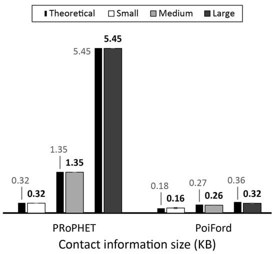 For example, consider the Universiti Teknologi Malaysia (UTM) campus which is located on 11.45 KM2 of land [55] and registers about 18,000 students (as of 2017) [56]. It is fair to say that every student owns a portable handheld device. An IoT scenario would also consist of other nodes such as smart vehicles, sensors, access points and appliances equipped with short-range wireless communication interfaces. So let us assume that 80% of the students live in-campus and other nodes besides portable handheld devices account for 40% of the total node population in the scenario. Then, the number of portable handheld devices and other nodes becomes 14,400 and 6000, respectively, making a total of 24,000 networking nodes. Taking and as 10 bytes (i.e., a string of 5 characters) and 8 bytes, respectively, a portable handheld device would eventually maintain about 0.432 MB of contact information (using Equation (1)). Hence, portable handheld devices would have to send and receive a total of about twice this amount (i.e., 0.864 MB) of contact information whenever they encounter each other.