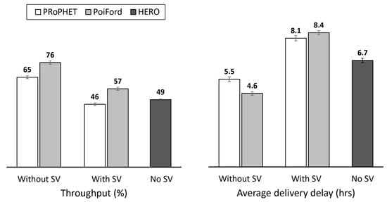 Throughput and average delivery delay of PRoPHET, PoiFord and HERO.