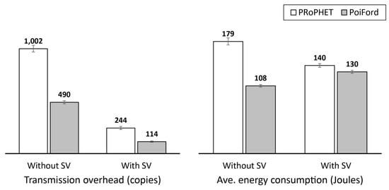Message transmission overhead and average energy consumption of PRoPHET and PoiFord (note that energy consumption in these results is mainly for purpose of comparison, and does not represent realistic energy values).