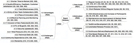 The following advantages were identified in the literature (RQ4—part 1): Shorter Time to Market (4.1.1), Quality: Efficiency, Feedback, Customer Satisfaction (4.1.2), Test Effectiveness (4.1.3) Entry of New Team Collaborators (4.1.4), Pace of Innovation (4.1.5), Effective Planning and Monitoring (4.1.6), Inclusion of New Features (4.1.7), Fix of Bugs (4.1.8), and Security Updates (4.1.9). The challenges (RQ4—part 2) reported were dealing with Time Pressure (4.2.1), Technical Debt (4.2.2), Community Dependence (4.2.3) and Reliability (4.2.4).