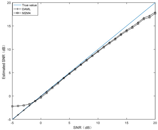 The SNR fitting curve of the DA ML and M2M4 estimators are shown in Figure 3. The horizontal axis in the figure is shown as the actual SNR, which is the assumed value in the MATLAB simulation and is the channel environment in the actual communication. The ordinate is the SNR estimated by the Formulas (28) and (35) in Section 4. The horizontal and ordinate of the truth values are all the actual values of SNR and the true values are the standard used to measure the offset of estimate SNR and actual SNR. The DA ML estimator can be approximated as unbiased when SNR is less than 5 dB. The estimation error is large in the case of medium and high SNR. The estimation bias increases with the increase of SNR. The M2M4 estimator can be approximated as unbiased when SNR is medium (near 5 dB), but the estimation error is significantly large at low and high SNRs.