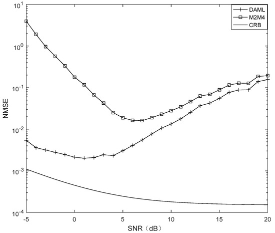 The NMSE of the DA ML and M2M4 estimators are shown in Figure 4. The DA ML estimator has the best performance when SNR is approximately 0 dB, but the performance becomes worse with the increase of SNR. The M2M4 estimator has the best estimation performance when SNR is near 7 dB. The performance curve of the M2M4 estimator is similar to a parabola, and the performance is poor at low SNR. The performance becomes worse with the increase of SNR after 7 dB. The two estimators cannot achieve the Cramer-Rao bounds and the existence of the SNR node. The performance worsens with the increase of SNR after the node because the non-CM characteristics introduced by the fading factor. When the SNR is low, the noise power is the main factor affecting the estimation performance due to the large noise power, while the signal power is the main factor affecting the estimation performance in the medium to high SNR. In the process of signal power estimation, it is necessary to do the division of the mean of the fading factor as in Formulas (18). The difference between the estimated value and actual value of the signal power is greater with the increase of SNR, which will lead to the worse performance. The DA ML estimator displays better performance than the M2M4 estimator, especially in the low SNR. The performance gap between the two estimators is reduced gradually when the SNR is medium or high. The two estimators are close to each other in practical applications when the channel environment is good. Thus, the M2M4 estimator can be used to reduce the complexity. The DA ML estimator can be used to improve the estimation performance when the channel environment is poor, and the transmitter information sequence is known.