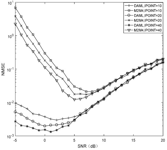 The NMSEs of DA ML and M2M4 for IPOINT = 10, 20, 40 are plotted in Figure 5. The estimation performance improves with the increase in the number of sampling points per symbol.
