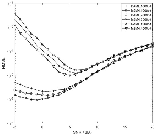 The NMSEs of DA ML and M2M4 for the length of transmission information for 1000, 2000, and 4000 bits are plotted in Figure 6. The estimation performance improves the longer the transmitted information.