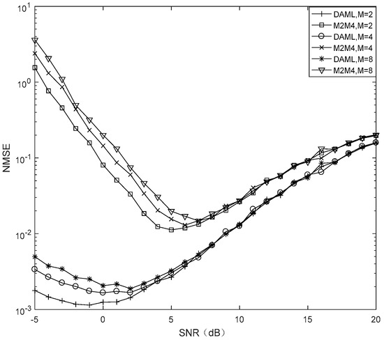 The NMSEs of DA ML and M2M4 for M = 2, 4, 8 are plotted in Figure 7. The estimation performance improves as the CPM modulation order becomes smaller.