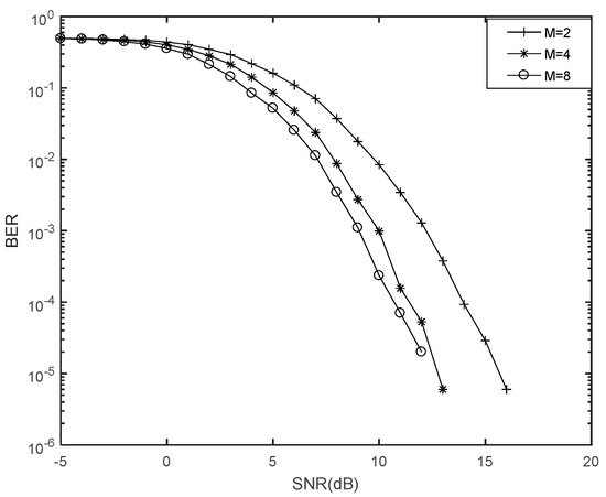 The BER for different modulation orders are shown in Figure 8. For the same SNR, the BER of the system decreases as the modulation order becomes larger. The target BER is assumed to be 10−4. When the SNR is less than 10.6 dB, all the three modulation orders can’t achieve the target BER, we can choose a low BER method as the modulation order of the system, that is M = 8. When the SNR is within the range of 10.6 dB to 11.4 dB, only M = 8 can achieve the target BER, so we still choose M = 8 as the modulation order of the system. When SNR is in the range of 11.4 dB to 14 dB, both M = 4 and M = 8 can achieve the target BER. Because of the higher frequency band utilization rate of M = 4, we select M = 4 as the modulation order of the system. When the SNR is greater than 14 dB, all the three modulation orders can achieve the target BER. Because of the highest frequency band utilization in M = 2, we select M = 2 as the modulation order of the system. When SNR grows the modulation order is decreased by the ACM control loop, when SNR drops down higher modulations have to be used.