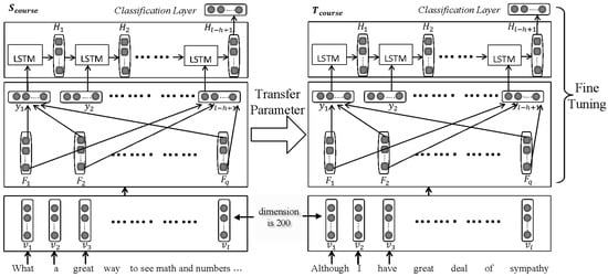 Based on the special characteristics listed above, we determined that this problem is particularly well suited for deep neural networks. We propose a new transfer learning method based on the convolutional neural network (CNN) [] and the long short-term memory (LSTM) [] network, known as ConvL. We first apply the convolution operation to obtain a feature that is well depicted and then apply LSTM to learn a post representation, which considers the long-term temporal semantic relationships of features. We transfer the model parameters trained on the source domain course to the target domain course and subsequently fine-tune them. Experiments on a Stanford MOOC post dataset demonstrate that our proposed framework can effectively fulfill the tasks of classifying confusion/urgency/sentiment, learning a nondiscrimination feature representation from the source course and transferring it to the target course.