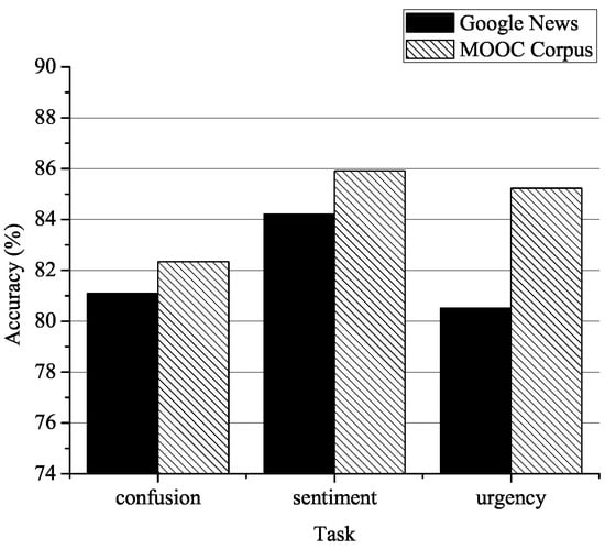 Corpus for training word vector: We compared the word-embedding weight pre-trained by Google News and the MOOC corpus. The dataset is as depicted in Section 5.1 and the experimental parameters as depicted in Section 5.2, except the word embedding and the baseline model is ConvL. Figure 2 shows that as a weight for the embedding layer, the word vector pre-trained by the MOOC corpus results in performance superior to that of the word vector pre-trained by Google News on all tasks. We conclude that, for cross-domain MOOC forum post classification, a word vector pre-trained using a corpus specific to the task performs better and can introduce more relevant semantic knowledge than one pre-trained on Google News.