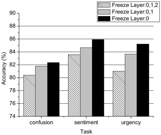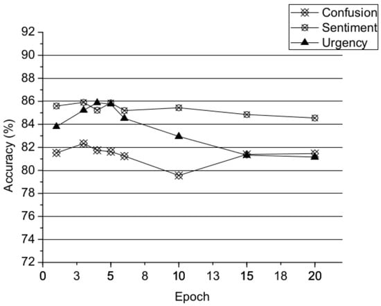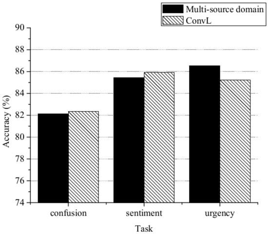 Multi-source course: We also compared multi-source and single-source domains. The data are from the dataset as depict in Section 5.1, and the baseline model is ConvL. For the multi-source domain, we used one domain as the target domain and the remaining two domains as the source domain. We constructed three cross-domain classification subtasks: {Edu, HS} → Med, {Edu, Med} → HS, {Med, HS} → Edu. In the process of training , the training set consisted of 9/10 of the two source domain data, and the validation set was the remaining 1/10. The process of training was the same. The rest of the parameters are as depicted in Section 5.2. Deep learning has been demonstrated to work well on large corpuses. As shown in Figure 5, for urgency classification, as the source domain training data expands, more useful knowledge is introduced, which is advantageous for cross-domain urgency classification. The accuracy of training on multi-source domains was 86.55%. This performance exceeds even that of LSTM-TL trained on one source domain. However, for the confusion/sentiment classification task, the performance of our method when using a multi-source domain is worse. Thus, different classification tasks require different training sample selection methods. Cross-domain performance varies significantly depending on the choice of training samples.