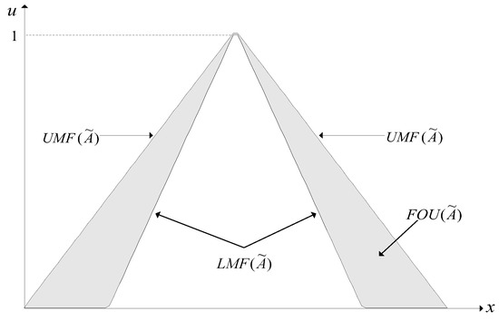 The type-2 fuzzy set (T2-FS) was first introduced by Zadeh, which can be seen as an extension of the traditional fuzzy set [35,36]. Compared with the traditional fuzzy set, the membership function (MF) of T2-FS is one fuzzy set rather than a precise value. The MF of general T2-FS is composed of the main MF and the secondary MF. Interval type-2 fuzzy set (IT2-FS) as a special case is characterized as: the secondary MF degree of T2-FS is one, so its related computing and operation are simpler than the corresponding type-2 counterpart. An illustration of an IT2-FS is show in Figure 2. Observe that the IT2-FS is bounded from above and below by two type-1 fuzzy sets, which are called the upper MF (UMF) and the lower MF (LMF), respectively. The footprint of uncertainty (FOU) consists of the area between UMF and LMF .