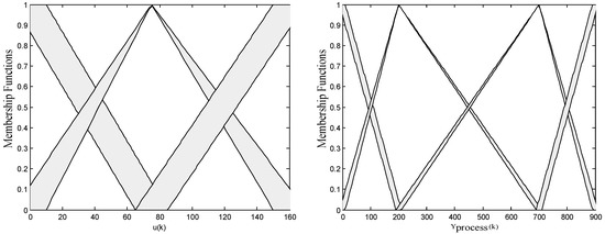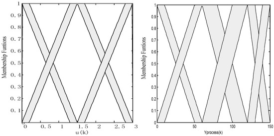 Let us design a simple IT2-FM with two inputs (u(k), ) and one output (). The u(k) and represent the output of the inverse controller to be designed and process output, respectively. The represents the output of the IT2-FM, which is utilized to approach the output of the original process. The antecedent MFs for the inputs u(k) and are shown in Figure 5. The total number of the fuzzy rules is 3 × 4 = 12. The rule base and consequents are given in Table 1. The reasoning process of the IT2-FM is described in detail in Section 2.