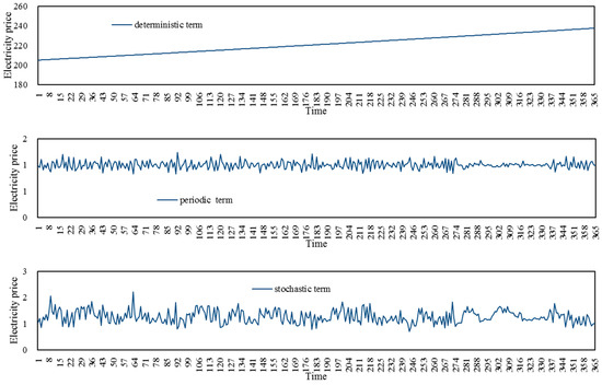 Decomposed deterministic term, periodic term, and stochastic term of original daily electricity price time series.