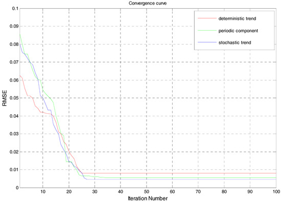 The iterative RMSE trends of FOA-LSSVM model for deterministic term, periodic term, and stochastic term.