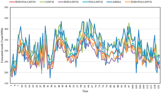 The RMSEs, MAPEs and MAEs of these six forecasting models, namely, BND-FOA-LSSVM, LSSVM, BND-LSSVM, FOA-LSSVM, ARIMA and EMD-FOA-LSSVM, are listed in Table 3. From the perspective of RMSE, the proposed BND-FOA-LSSVM model has the best forecasting performance because it has the minimum RMSE (namely 11.18 Yuan/MWh), followed by the EMD-FOA-LSSVM, FOA-LSSVM, BND-LSSVM, LSSVM, and ARIMA models. The RMSE of the BND-FOA-LSSVM model is (12.06 − 11.18)/12.06 = 7.30%, (18.05 − 11.18)/18.05 = 38.06%, (21.36 − 11.18)/21.36 = 47.66%, (50.78 − 11.18)/50.78 = 77.98%, and (53.43 − 11.18)/53.43 = 79.08% lower than that of the EMD-FOA-LSSVM, FOA-LSSVM, BND-LSSVM, LSSVM, and ARIMA models, respectively. From the perspective of MAPE, the proposed BND-FOA-LSSVM model still has the minimum MAPE value, which is 3.48%, much lower than that of the LSSVM, BND-LSSVM, FOA-LSSVM, ARIMA, and EMD-FOA-LSSVM models. The MAPE of the BND-FOA-LSSVM model is (3.76 − 3.48)/3.76 = 7.45%, (5.84 − 3.48)/5.84 =40.41%, (7.27 − 3.48)/7.27 = 52.13%, (16.89 − 3.48)/16.89 = 79.40%, and (17.71 − 3.48)/17.71 = 80.35% lower than that of EMD-FOA-LSSVM, FOA-LSSVM, BND-LSSVM, LSSVM, and ARIMA models, respectively. Meanwhile, the proposed BND-FOA-LSSVM model obtains the minimum MAE, which is 9.95 Yuan/MWh. The MAE of the BND-FOA-LSSVM model is (10.81 − 9.95)/10.81 = 7.96%, (16.92 − 9.95)/16.92 = 41.19%, (20.82 − 9.95)/20.82 = 52.21%, (48.50 − 9.95)/48.50 = 79.48%, and (50.63 − 9.95)/50.63 = 80.35% lower than that of the EMD-FOA-LSSVM, FOA-LSSVM, BND-LSSVM, LSSVM, and ARIMA models, respectively.