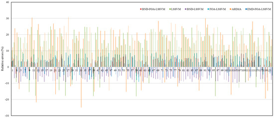 The electricity price forecasting results of the proposed BND-FOA-LSSVM, single LSSVM, BND-LSSVM, FOA-LSSVM, ARIMA and EMD-FOA-LSSVM models are shown in Figure 6, and the relative errors of forecasted electricity price by using these six models are listed in Figure 7. From Figure 7, it can be seen that all the relative errors of forecasted electricity price of the proposed BND-FOA-LSSVM model are smaller than 6.8%, and some are even smaller than 1%, such as 5 September, 26 September, 1 October, 15 October, 17 October, 2 December, 5 December, 15 December, 16 December, 18 December, and 30 December. However, the relative errors of forecasted electricity price of single LSSVM and ARIMA models are much larger, and some are more than 20%. The maximum and minimum relative errors of BND-LSSVM model are, respectively, −9.88% and 4.14%, and those of FOA-LSSVM model are, respectively, −9.13% and 2.26%. The maximum and minimum relative errors of EMD-FOA-LSSVM model are, respectively, 7% and 0.48%. Therefore, it can be said that, from the perspective of relative error, the proposed BND-FOA-LSSVM model has the best electricity price forecasting performance.