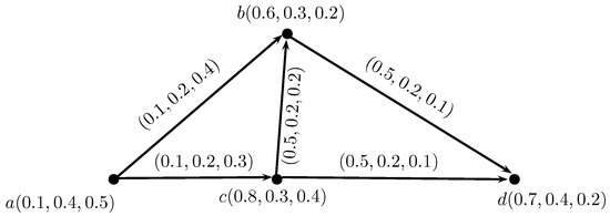 Suppose, is an IN-digraph. Suppose , , q, , where , q and r are the truth-membership, indeterminacy-membership and falsity-membership values of either the edge , or the edge , , respectively. Here,