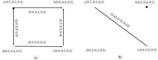 Suppose , h, is an IN-digraph. The m-step INC-graph of IN-digraph is denoted by , h, , which has the same intuitionistic neutrosophic set of vertices as in and has an edge between two vertices w, in if and only if is a non-empty IN-set in . The truth-membership value of edge , in is , ; the indeterminacy-membership value of edge , in is , ; and the falsity-membership value of edge , in is , .