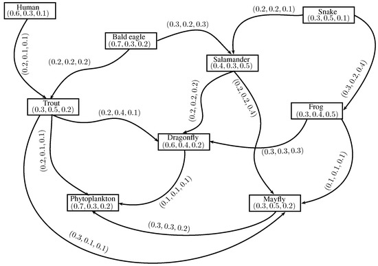 Consider a small ecosystem: human eats trout; bald eagle eats trout and salamander; trout eats phytoplankton, mayfly and dragonfly; salamander eats dragonfly and mayfly; snake eats salamander and frog; frog eats dragonfly and mayfly; mayfly eats phytoplankton; dragonfly eats phytoplankton. These nine species human, bald eagle, salamander, snake, frog, dragonfly, trout, mayfly and phytoplankton are taken as vertices. Let the degree of existence in the ecosystem of human be , the degree of indeterminacy of existence be and the degree of false-existence be , i.e., the truth-membership, indeterminacy-membership and falsity-membership values of the vertex human are , , . Similarly, we assume the truth-membership, indeterminacy-membership and falsity-membership values of other vertices as , , , , , , , , , , , , , , , , , , , , and , , . Suppose that human likes to eat trout , indeterminate to eat and dislike to eat, say . The likeness, indeterminacy and dislikeness of preys for predators are shown in Table 7.