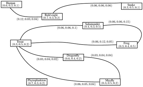 Now, there is an edge between human and bald eagle; snake and bald eagle; salamander and trout; salamander and frog; trout and frog; trout and dragonfly; trout and mayfly; dragonfly and mayfly in the INC-graph, which highlights the competition between them; and for the other pair of species, there is no edge, which indicates that there is no competition in the INC-graph Figure 18. For example, there is an edge between human and bald eagle indicating a degree of likeness to prey on the same species, a degree of indeterminacy and a degree of non-likeness between them.