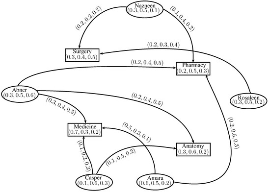 The INC-graph is shown in Figure 20. The solids lines indicate the strength of competition between two applicants, and dashed lines indicate the applicant competing for the particular career. For example, Nazneen and Rosaleen both are competing for the career, surgery, and the strength of competition between them is , , . In Table 10, , represents the competition of applicant z for career c with respect to loyalty quality, indeterminacy and disloyalty to compete with the others. The strength to compete with the other applicants with respect to a particular career is calculated in Table 10.