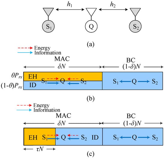 Figure 1b,c illustrate the SWIPT methods for the DF-TWR protocol when devices S 1 and S 2 exchange their messages w 1 and w 2 with each other. For the DF-TWR, a data frame is divided into MAC and BC phases of δ N and ( 1 δ ) N durations, respectively, where N is the number of symbols comprising the data frame and 0 < δ < 1 is the time-phase (TP) ratio of the MAC phase in the data frame. In the MAC phase, S 1 and S 2 transmit their symbol vectors x 1 and x 2 containing the messages, as in [25], to the relay simultaneously. The relay harvests the energy as well as decodes the messages w 1 and w 2 by splitting the received signal in the MAC phase. The signal splitting is accomplished either in the power domain with PS ratio θ , as in Figure 1b, or in the time domain with TS ratio τ , as shown in Figure 1c, where 0 < θ < 1 and 0 < τ < δ . The harvested energy is then given by