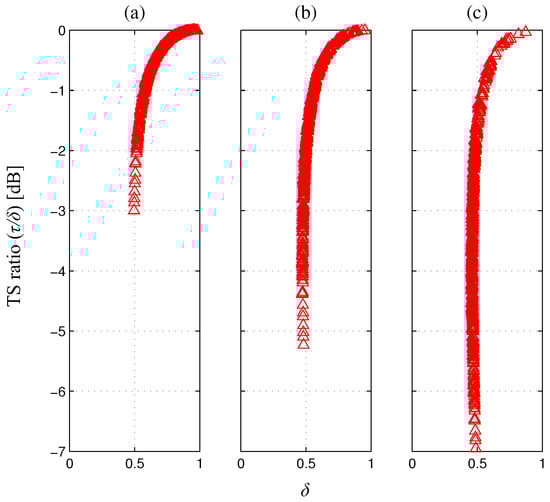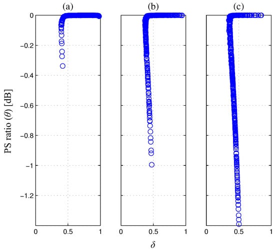 Figure 2 provides the constellation of the optimized TP and PS ratios ( δ , θ ) obtained by solving the problem (9)–(12) for 500 channel realizations when ν = 3 and d 1 / D = 0.5 . The optimized values are shown in the subfigures with different transmit power as P = 10 , 20, and 30 dBm. Figure 3 provides the constellation of the optimized TP and TS ratios ( δ , τ / δ ) obtained by solving the problem (28)–(31) under the same configuration with Figure 2. The parameter values optimizing the sum rate are observed to have a different tendency from those optimizing the outage probability [25] in that the TP ratio tends to have values around δ = 0.5 for both the PS-SWIPT and TS-SWIPT. When the transmit power is as small as P = 10 dBm, the splitting ratio (PS ratio for the PS-SWIPT and TS ratio for the TS-SWIPT) tends to have a value close to 1 since the energy harvested in the MAC phase dominates the performance. As the transmit power increases, the splitting ratio varies in a large degree to balance the harvested energy and the reliably deliverable information rate for each channel realization.