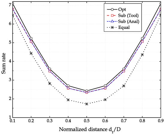 Figure 4 compares the sum rate of the PS-SWIPT with different resource allocation methods when P = 20 dBm and ν = 3 . The abscissa is the normalized distance d 1 / D between S 1 and Q . The results of “Opt” and “Sub (Tool)” are obtained by employing the convex optimization solver YALMIP [37] to find the solution of the joint optimization problem (13)–(16) and the suboptimal problem (17)–(19), respectively, the results of “Sub (Anal)” are obtained with the closed-form solution (24) for the suboptimal problem (17)–(19), and the results of “Equal” are obtained with ( θ , δ ) = ( 0.5 , 0.5 ) . It should be mentioned that the performance obtained with the analytically derived solution is indistinguishable from that obtained with the convex optimization solver for the suboptimal problem. The joint resource allocation method shows the best performance, but the suboptimal method with the closed-form solution provides a performance close to the optimal one. Therefore, the suboptimal method is favorable to avoid the time-consuming computation in solving the joint optimization problems with the convex optimization solver. The sum rate decreases steeply as the relay moves toward the center location due to the energy harvesting relay which suffers from a large loss in the harvested energy as the distance increases. This observation is the opposite of that in the traditional DF-TWR without the SWIPT which provides the best performance at the center location of the relay.