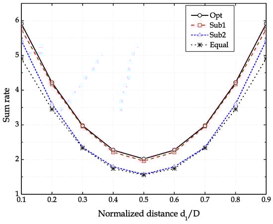 Figure 4. Sum rate of the PS-SWIPT with different resource allocation methods as a function of d 1 / D when P = 20 dBm and ν = 3 .