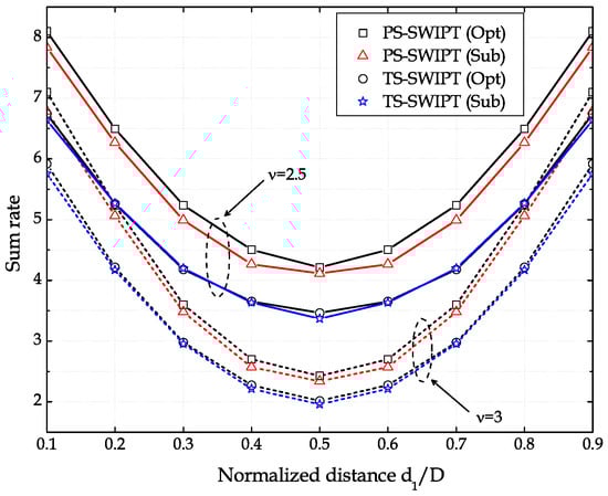 Figure 6 compares the sum rate of the two SWIPT methods as a function of the normalized distance d 1 / D when P = 20 dBm. The optimal and suboptimal resource allocation methods are compared in the channels with different path exponents of ν = 2.5 and ν = 3 , where the suboptimal methods optimize the splitting ratio after fixing δ = 0.5 for both SWIPT methods. The results show that the sum rate performance is improved significantly as the path loss exponent decreases from 3 to 2.5 since the harvested energy increases significantly. The PS-SWIPT methods outperform the TS-SWIPT methods in the sum rate as observed in the outage probability in [25]. In addition, the optimal and suboptimal methods exhibit very close performances for each SWIPT method.