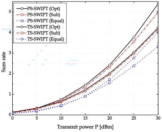 Figure 5 compares the sum rate of the TS-SWIPT with different resource allocation methods under the same conditions with Figure 4. In the figure, “Opt” denotes the performance obtained by solving the joint optimization problem (28)–(31) and “Equal” denotes the performance with ( τ , δ ) = ( 1 / 3 , 1 / 3 ) . The suboptimal methods “Sub1” and “Sub2” denote the performance obtained by optimizing τ in (28)–(31), after fixing δ = 0.5 from the observation in Figure 3 and δ = ( 1 τ ) / 2 for the equal data portions in the MAC and BC, respectively. The solutions for “Opt”, “Sub1”, and “Sub2” are obtained by employing the convex optimization solver YALMIP [37]. The best performance is achieved by the joint optimization method The suboptimal method “Sub1” with δ = 0.5 provides a performance closer to than the suboptimal method “Sub1” with δ = ( 1 τ ) / 2 . This observation results from the fact that the BC phase dominates the performance by using the harvested energy so that the suboptimal method “Sub1” with asymmetric time allocation as 0.5 τ and 0.5 for the MAC and BC phases is more desirable than the suboptimal method `Sub2’ with symmetric time allocation as ( 1 τ ) / 2 and ( 1 τ ) / 2 .