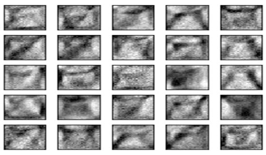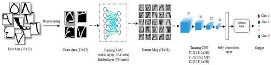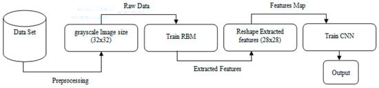 The objective of the RBM algorithm is to rebuild the inputs as accurately as possible. Throughout the forward stage, the input is changed on the basis of the weights and biases, and is then used to activate the hidden layer. In the next stage, the activations from the hidden layer are changed on the basis of the weights and biases and are then sent back to the input layer for activation. At this stage, the input layer seeks the modified activations as an input reconstruction and then uses this input to compare with the original input []. Therefore, in our proposed method, we use the advantages of RBM to extract useful features from raw data. The results are presented in Figure 3. The RBM model takes the entire input image with dimensions of 32 × 32 in a single one-dimensional array. The RBM was trained by unsupervised pre-training using contrastive divergence learning. Considering that RBMs only take a one-dimensional array as input, all two-dimensional matrices with pixel values were reshaped to one-dimensional arrays. We trained the RBM with 1024 visible input units (which correspond to all the pixels in a 32 × 32 picture) and 784 hidden output units (which correspond to all the elements in a 28 × 28 feature map). We used mini batches of size 200 with a fixed learning rate of 0.1 for 100 iterations. The corresponding reshaping was also performed on the output of the RBM; the one-dimensional output arrays are reshaped into two-dimensional matrices.