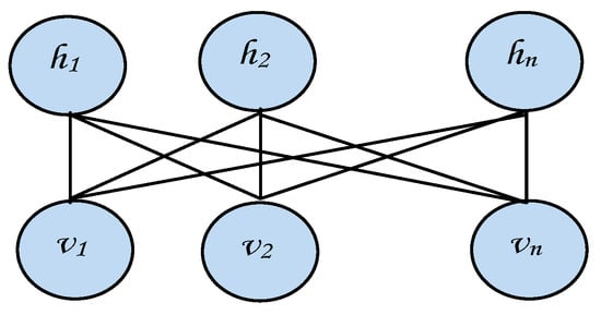 Previous research has used the RBM deep learning algorithm as a feature extraction method, as proposed by Hinton in []. RBMs present a high capability for feature extraction and representation; empirical research has proved that using the extracted features from the RBM algorithm instead of the raw data results in significant improvements in different machine learning applications, such as color image classification [], speech and object recognition []. The RBM deep learning algorithm is designed to extract the discriminative features from large and complex datasets by introducing hidden units in an unsupervised manner. RBM is a probabilistic network that learns the probability distribution of its inputs v and a hidden representation h. Figure 2 illustrates the standard RBM algorithm with two layers []. The main advantage of the RBM algorithm is that all hidden and visible units are independent, meaning that no connections occur between units in the same layer.