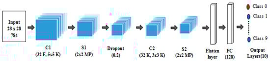 CNN is a sequence of layers, and every layer of a CNN architecture transforms one volume of activations to another through a differential function. In our CNN architecture, we use three main types of layers—Convolutional Layer, Pooling Layer (Max-pooling), and Fully Connected Layer—to control the overfitting process. We added a dropout layer with 20%, and our proposed CNN architecture and parameters are described in Section 2.2. In Table 6, we also compare our proposed CNN architecture with the CNN architecture described in [].