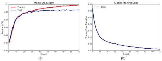 Comparison results of the proposed method and state-of-the-art methods on the CMATERDB 3.3.1 dataset are listed in Table 5. We selected the best recognition results generated by related learning algorithms applied on the CMATERDB 3.3.1 training data. From the said table, the highest accuracy rates using the CMATERDB 3.3.1 dataset can be seen to be 97.4% using CNN []. However, a significant achievement is made by our proposed method using the RBM deep learning algorithm for feature extraction and the CNN deep learning algorithm for classification. Specifically, the highest accuracy rate of the proposed method reached 98.59%, which is higher than the results for the state-of-the-art methods. These findings demonstrate that feature extraction and dimension reduction via RBM can improve the generalization performance of CNN. As shown in Figure 6a, the proposed approach obtains the best recognition rate on the CMATERDB test set. Figure 6b presents the training error rate of our proposed model.