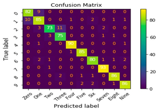 The computational disadvantage of the RBM-SVM, Sparse RBM-SVM and CNN against the proposed RBM–CNN is that RBM–CNN uses the RBM deep learning algorithm in its first stage to detect the features of images in a highly robust manner. Then, the CNN model is trained over the extracted features, and can easily detect the image class accurately, thereby exhibiting superior performance to RBM-SVM, Sparse RBM-SVM and CNN in classic image recognition problems. In our experiment, we demonstrate that the performance of our proposed RBM–CNN method enhances the accuracy in digit recognition, with an accuracy of 98.59%, which is the highest recorded accuracy for the CMATERDB 3.3.1 Arabic handwritten digit dataset. The confusion matrix of RBM–CNN trained with 100 epochs is shown in Figure 7. The overall classification performance is highly promising.