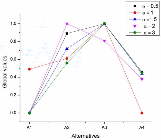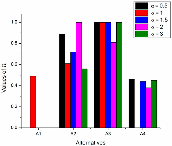 The impact of parameter on ranking order is examined by comparing the ranking orders taken with varying the different values of . When = 0.5, 1, 1.5, 2, 3, ranking order are presented in Table 8. We draw Figure 3 and Figure 4 to compare the ranking order for different values of . When = 0.5, = 1.5 and = 3, the ranking order is unchanged and A3 is the best alternative, while A1 is the worst alternative. When = 1, the ranking order is changed and A3 is the best alternative and A4 is the worst alternative. For = 2, the ranking order is changed and A2 is the best alternative and A1 is the worst alternative. From Table 8, we see that A3 is the best alternative in four cases and A1 is the worst for four cases. We can say that ranking order depends on parameter .