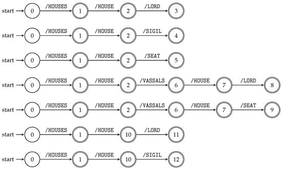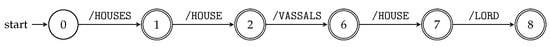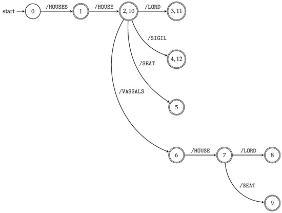 obtained. However, to satisfy XPath queries with the //-axis, we are interested in subsequences of a string path rather than its prefixes. Which is why we construct a subsequence automaton for each string path