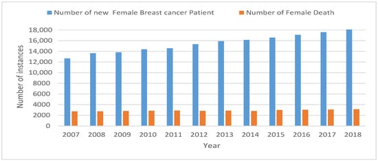 Cancer, being a serious threat to human life, is actually a combination of diseases, and more specifically unwanted and abnormal growth of the cells of the human body is known as cancer. Cancer can attack any part of the body and can then be distributed to any other part. Different types of cancer exist, but, among all the cancers, women are more vulnerable to Breast Cancer (BC) than men because of the anatomical structure of women. Statistics show that each year more people are newly affected by BC, at an alarming rate. Figure 1 shows the number of females newly facing BC as well as the number of females dying since the year 2007 in Australia. This figure shows that more and more females are newly facing BC, and the number of females dying of it has also increased in each year. This is the situation of Australia (population 20–25 million), but it can be used as a symbol of the BC situation of the whole world.