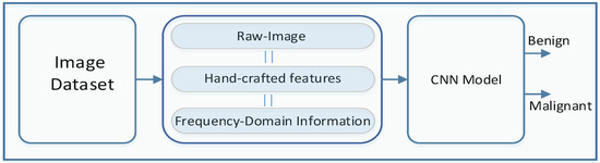 Conventionally, handcrafted features or local features are extracted and utilized for the input of a classifier model. However, in most of the work, using CNN-based image classification, raw images are fed directly to the CNN model. From the raw images, the CNN model tries to extract features globally. In this work, we have utilized raw images as well as descriptive handcrafted local features and frequency-domain information for the image classification along with the CNN model. Figure 3 shows the overall classifier model that has been used for the data classification.
